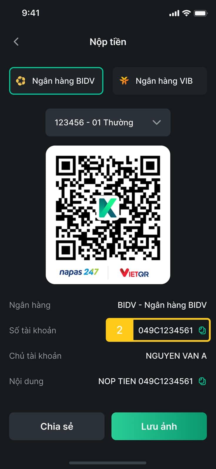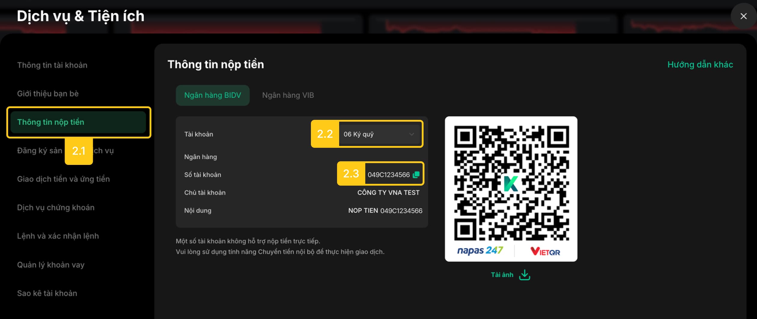 Vào Tiểu khoản ký quỹ: Nộp tiền vào TKCK số 049C0123456 của Nguyễn Văn A