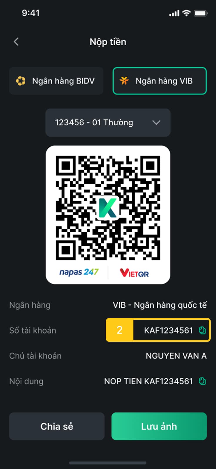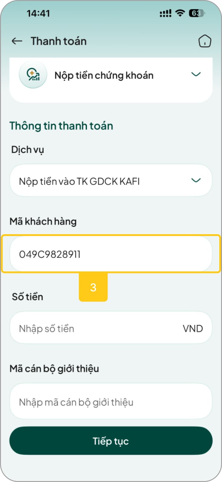 - VD: Khách hàng Nguyễn Văn A – số tài khoản lưu ký tại KAFI 049C012345 nộp tiền