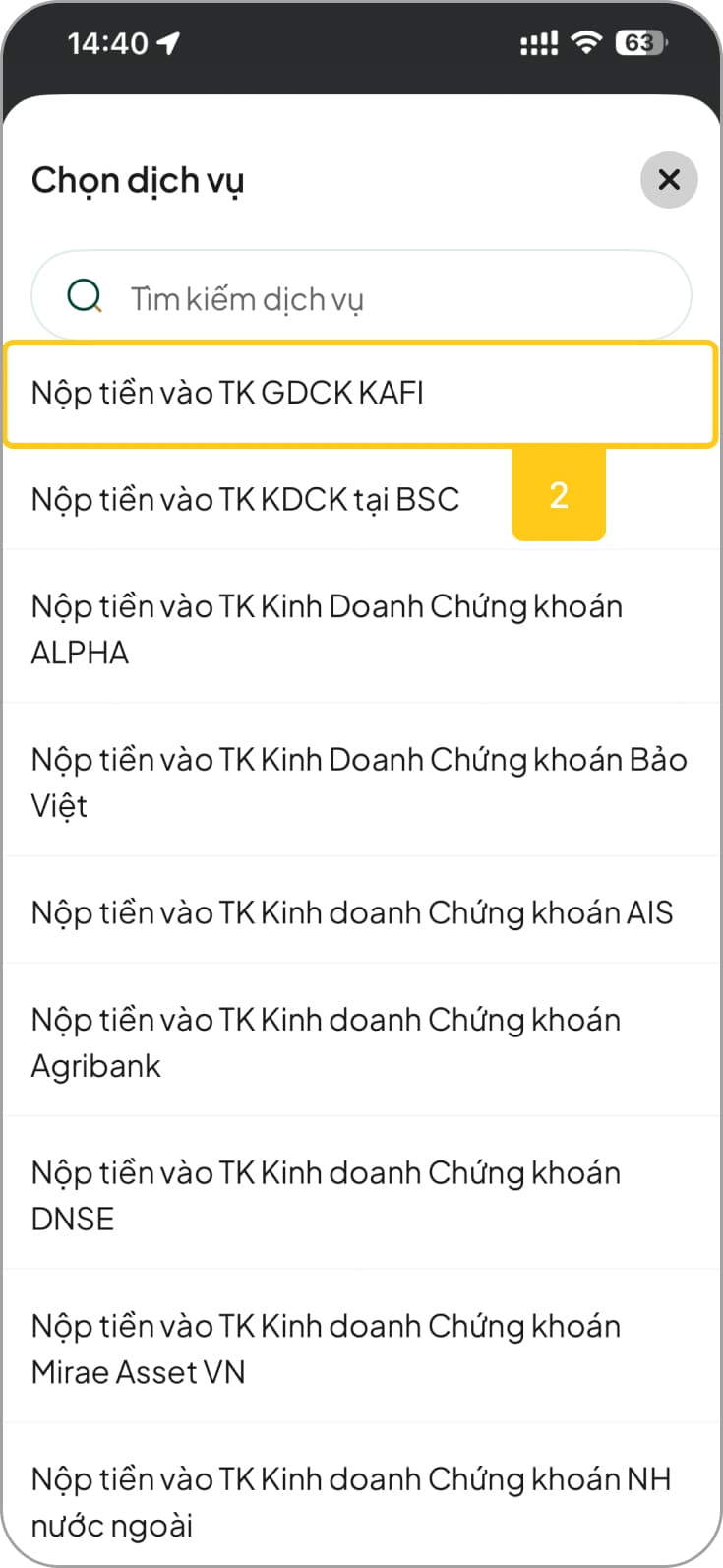 - Bước 2: Chọn Nộp tiền vào TKGDCK KAFI (hoặc tìm kiếm "Kafi" trên thanh tìm kiếm)