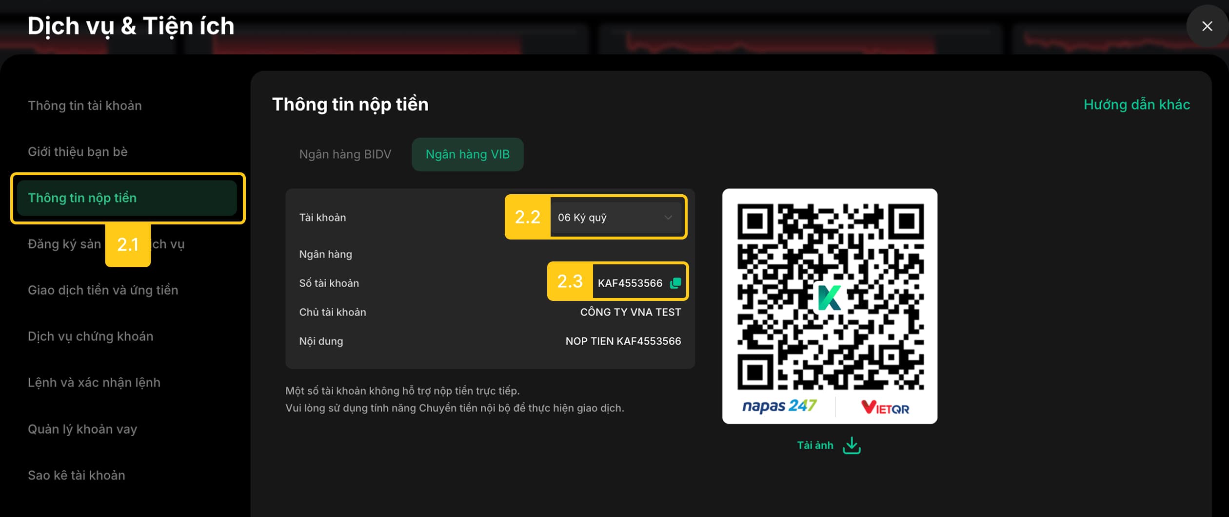 Nộp tiền vào TKCK số [Số tài khoản] [Tiểu khoản] của [Họ tên Khách hàng] Trong đó: